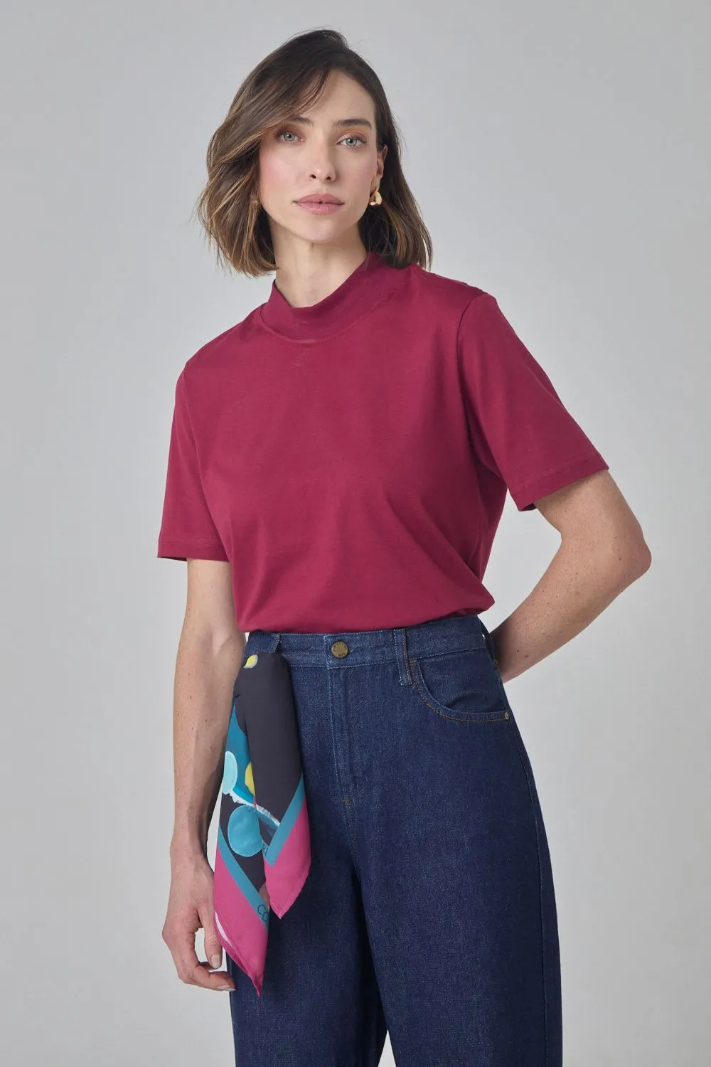 T-shirt gola alta em malha vinho
