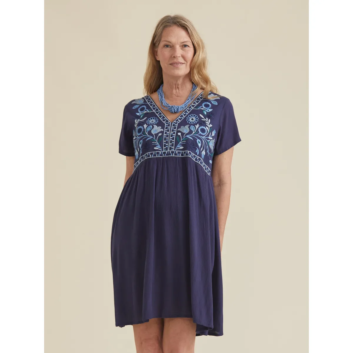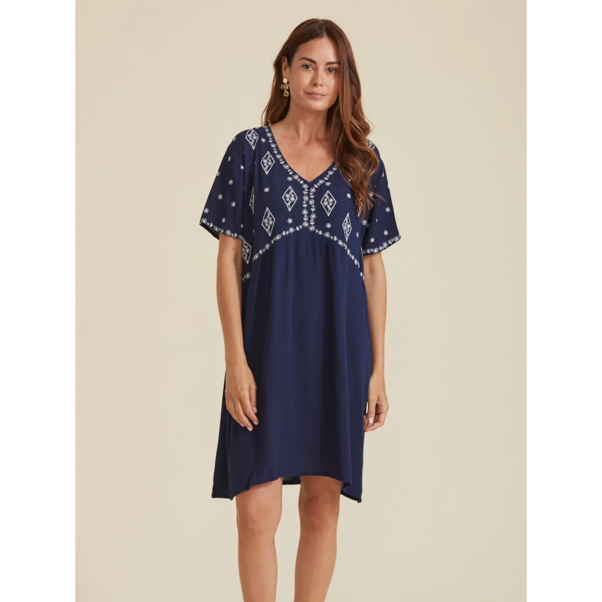 Vestido Curto com Bordados em Contraste