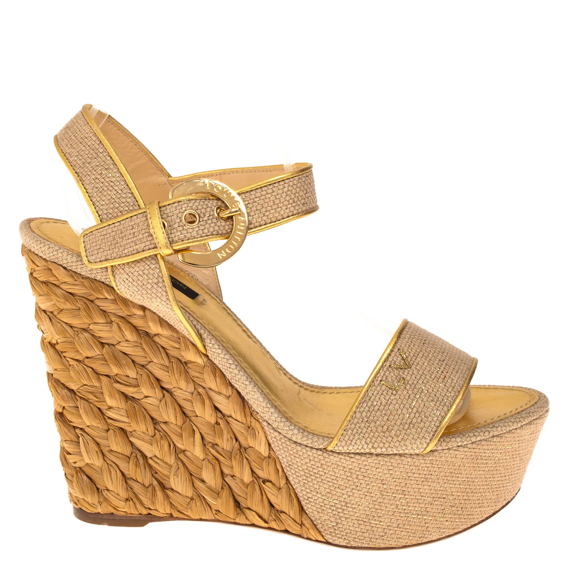 Sandália Louis Vuitton Anabela Ráfia Dourada