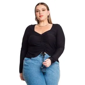 Blusa Feminina Rovitex Plus Size Manga Longa com Franzido Preto