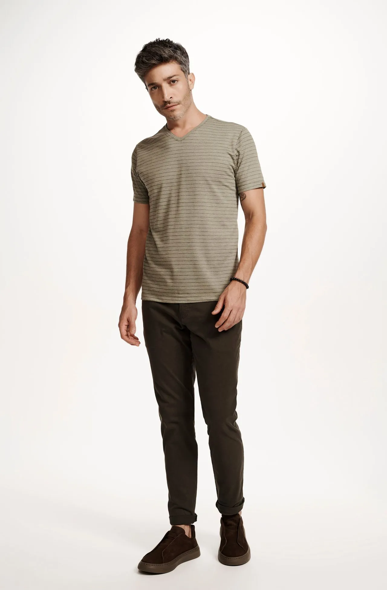 Camiseta Manga Curta Listrada Gola v Viscose Verde