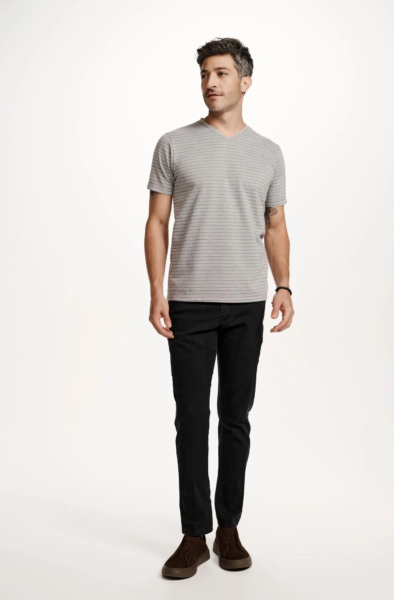 Camiseta Manga Curta Listrado Preto e Mescla