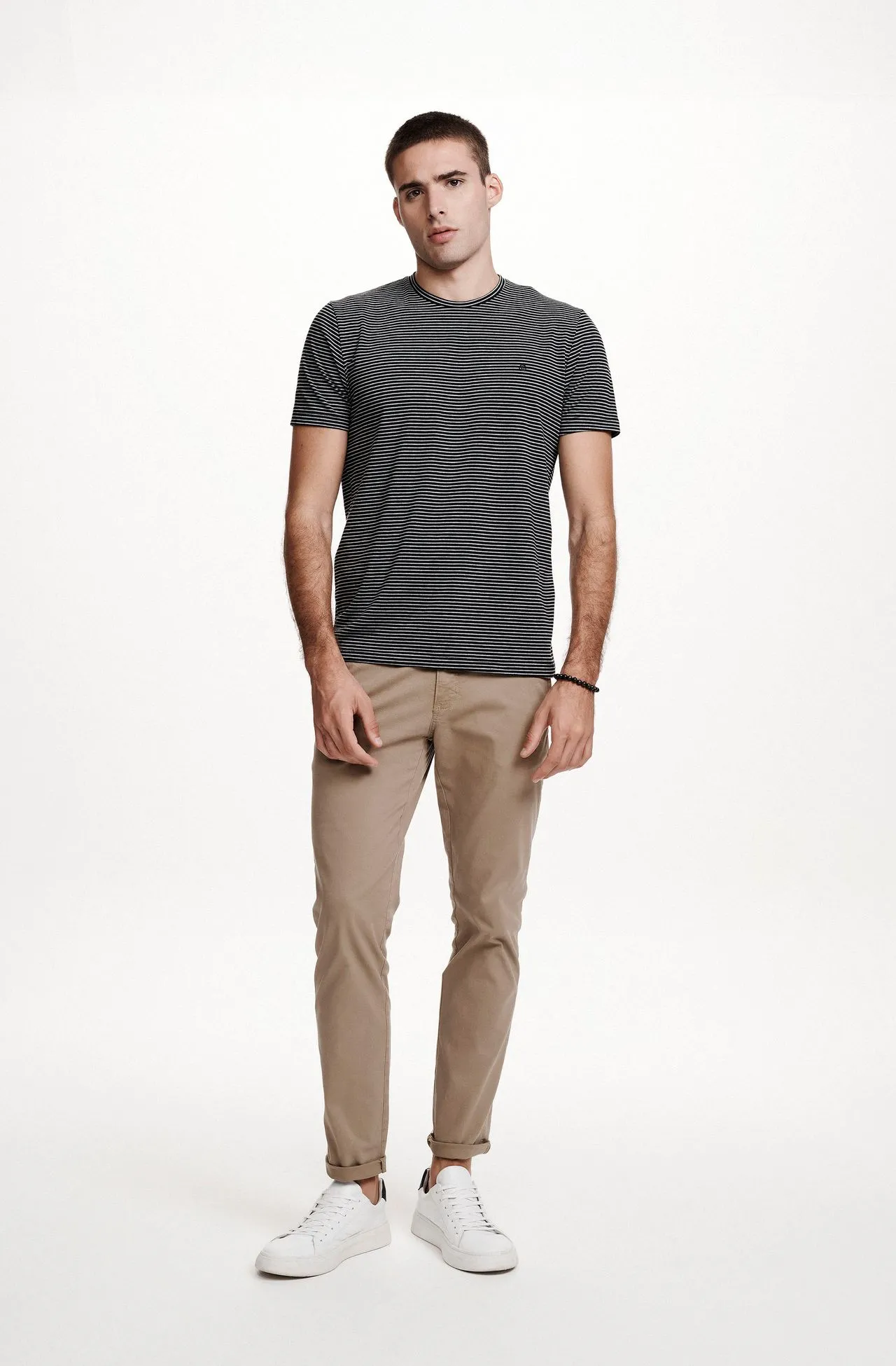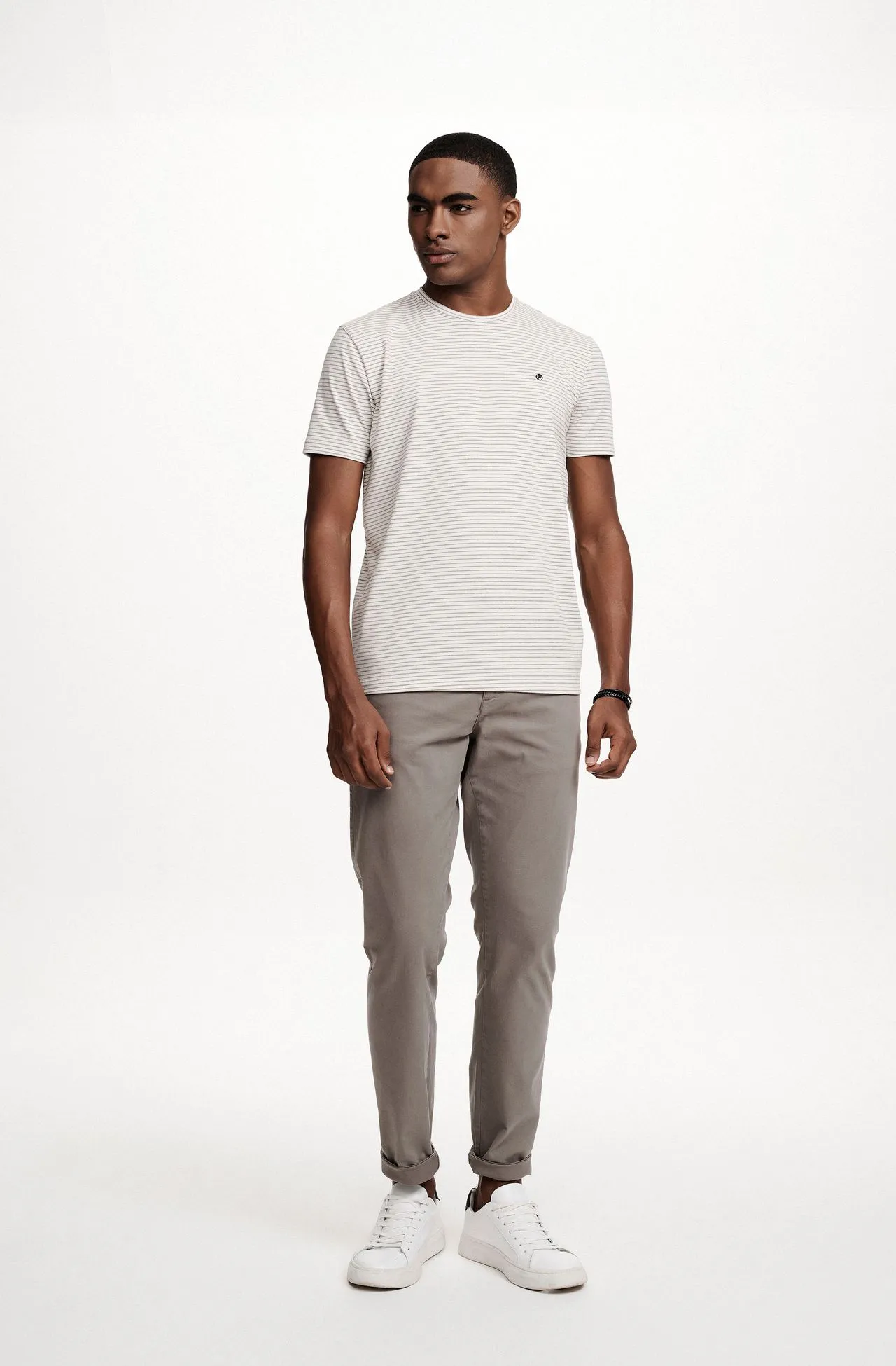 Camiseta Manga Curta Listrado Cru e Mescla