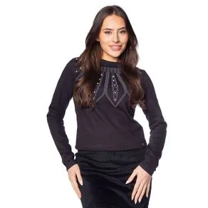 Confeccionada com uma mistura de poliéster, viscose e elastano, esta blusa oferece um toque suave e confortável contra a pele, ideal para o uso prolongado. Leve não apenas se ajusta graciosamente ao corpo, mas também proporciona uma textura agradável e visualmente interessante.