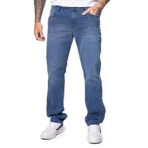 Calça confeccionada em jeans . A peça possui modelagem baggy com caimento solto, comprimento alongado, cintura média, cós com passantes aplicados, três bolsos frontais e dois bolsos posteriores, fechamento frontal por botão e zíper, barra acabamento simples.