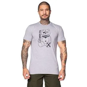 Diferencial: Malha leve e respirável, modelagem regular, estampa de listras geométricas em degradê, logo peito e costas, ribana na gola.